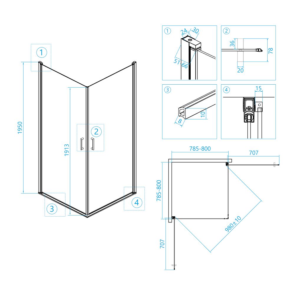 Форма душевого угла квадратная, что обеспечивает практичный дизайн и надежное крепление, а также удобство использования. Прозрачное стекло позволяет хорошо освещать пространство внутри душевого уголка и создавать эффект светового проигрывания, а цвет профиля хром выгодно выделяет душевой уголок из общего интерьера ванной комнаты.