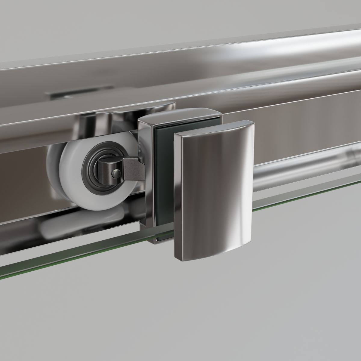 Прямоугольный угол образуют три стекла – два стационарных полотна и одно полотно «Дверь», которое при нажатии на дверную ручку плавно сдвигает дверное полотно вдоль второго стационарного полотна, образуя внутренний проход, не задействуя внешнее пространство входа. Ролики двойные, стальные, позволяют отстегнуть дверь для прочистки профиля.
