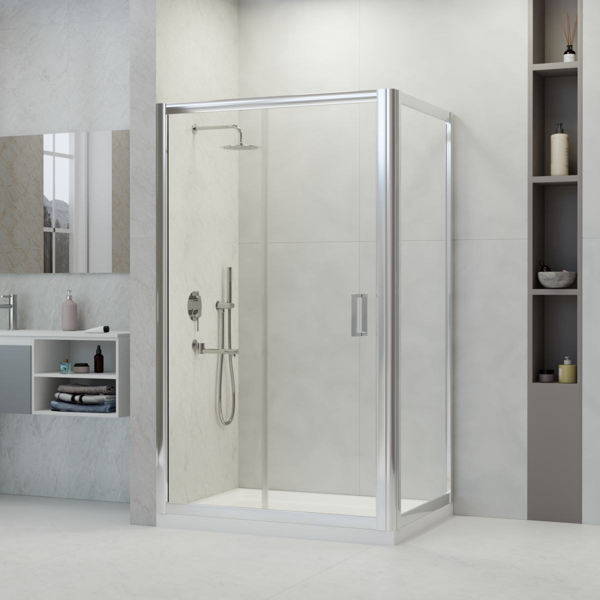 Г-образное ОГРАЖДЕНИЕ для душа из стекла в алюминиевом каркасе, сдвижная дверь к стене, которое при сборке образует закрытое, герметичное пространство душевой зоны в ванной комнате с индивидуальными характеристиками внутреннего устройства. Внутреннее пространство душевого угла определяется проектом и может иметь как минимальное наполнение, так и душевое оборудование с высокой степенью интенсивности, а также дополнительные аксессуары, например полки для ванной . Универсальный прямоугольный душевой угол устанавливается на душевой поддон или на подиум пола, который облицован керамической плиткой.