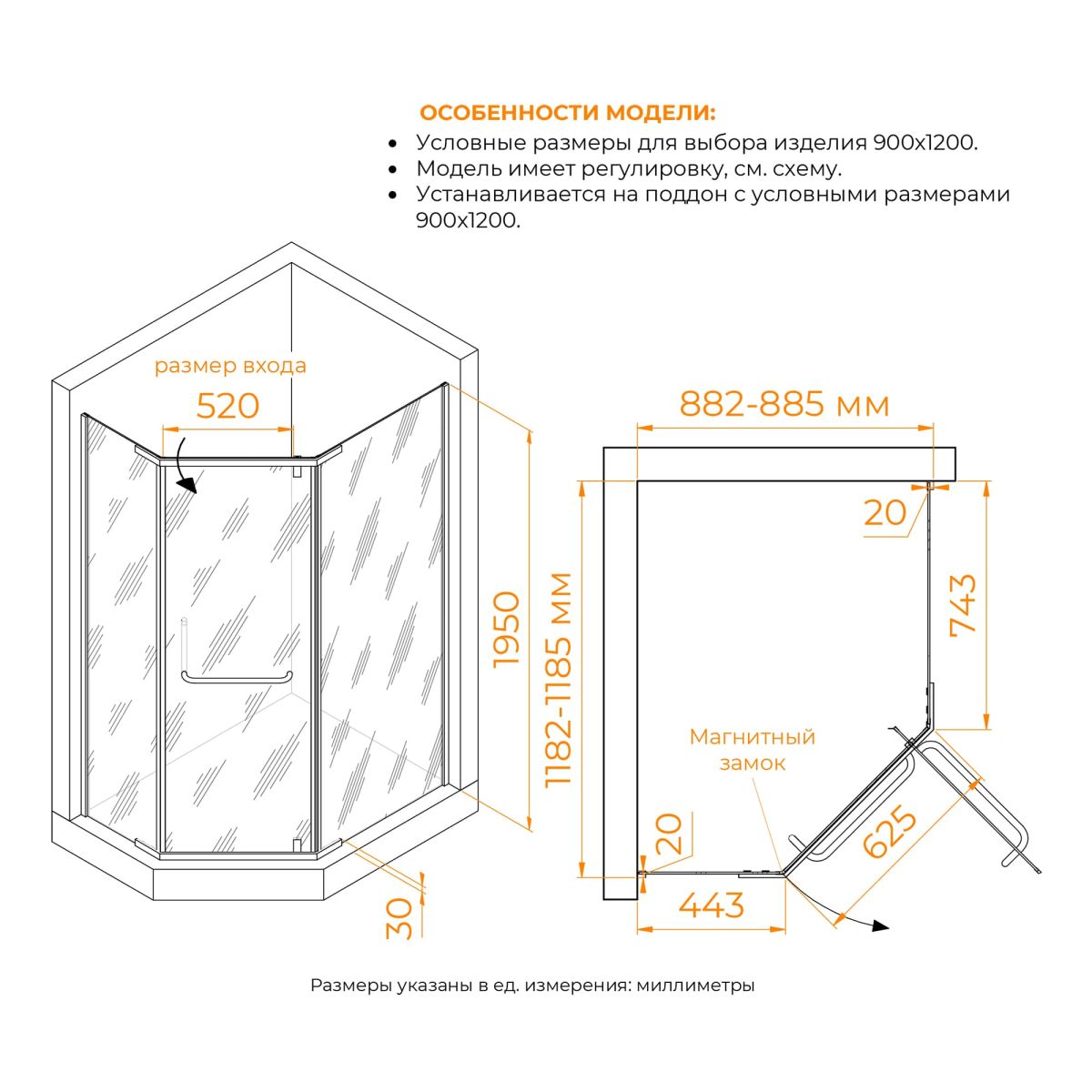 Душевой уголок RGW PA-091 – это изысканное решение для современной ванной комнаты. Сочетание прочного закаленного стекла толщиной 6 мм, элегантного хромированного профиля и асимметричной трапециевидной формы создает стильный и функциональный дизайн. Распашные двери с водонепроницаемыми петлями обеспечивают удобный доступ и герметичность. Специальное антикапельное покрытие Easy Clean упрощает уход за стеклом, а регулируемый профиль позволяет идеально вписать уголок в любое пространство.