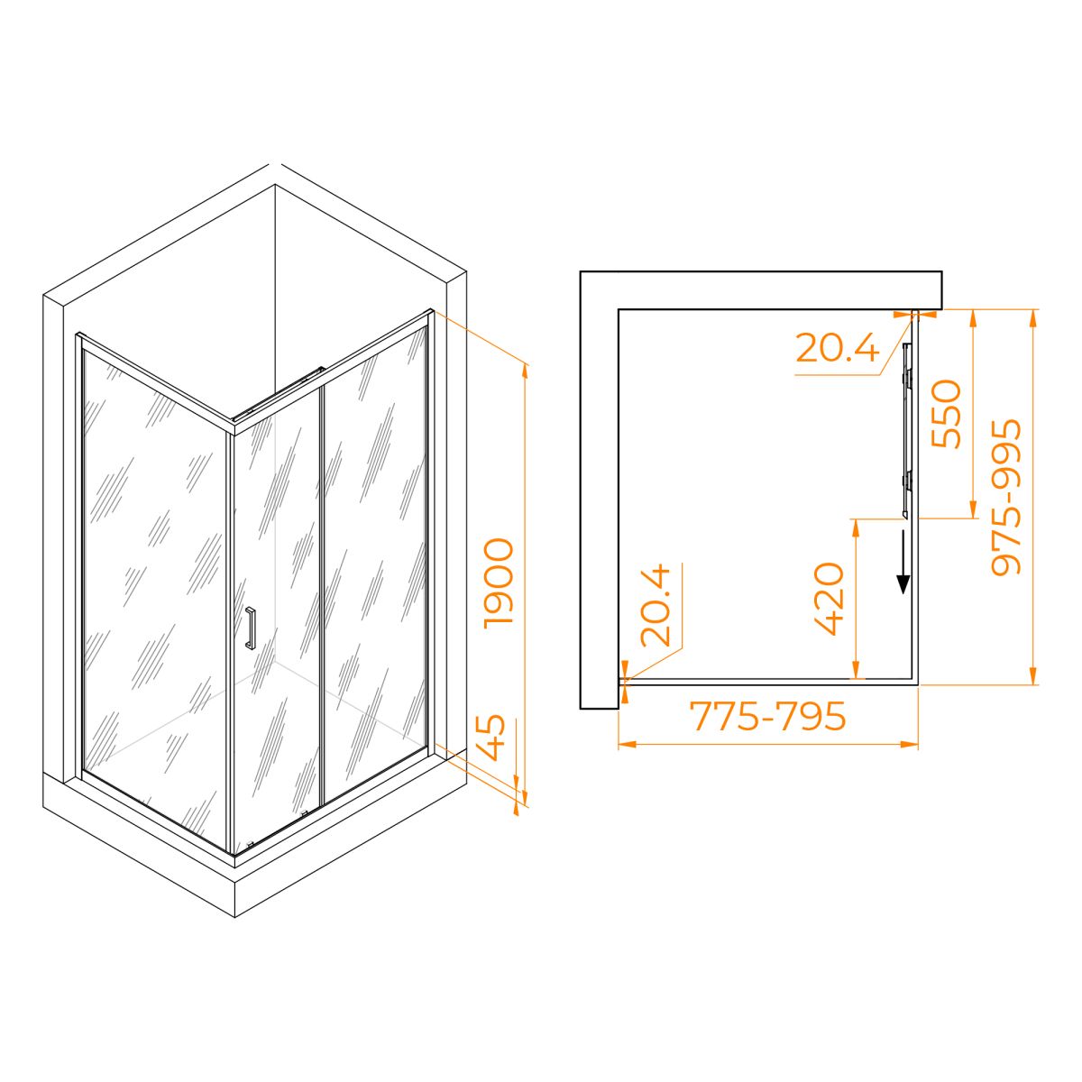 Двойные регулируемые ролики обеспечивают плавное и легкое открывание и закрывание дверей. Конструкция дверей раздвижная, что экономит место в ванной комнате и позволяет легко обслуживать душевой уголок.