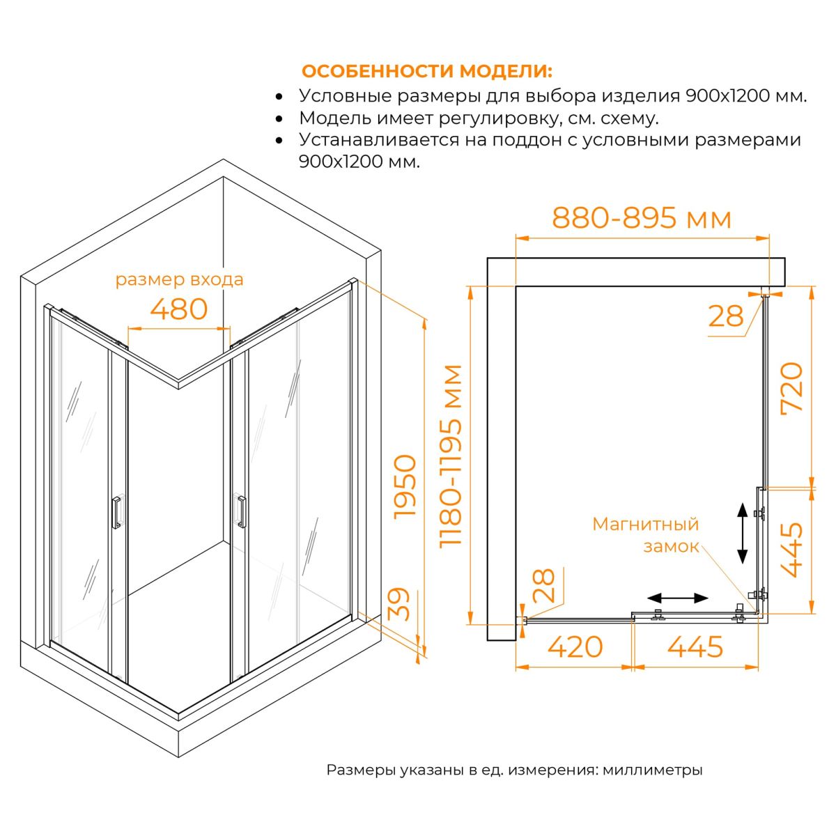 Высота душевого угла составляет 1950 мм, что позволит вам комфортно принимать душ, даже если вы высокого роста. Конструкция дверей раздвижная, что экономит место в ванной комнате. Этот душевой уголок также имеет регулируемый профиль, что позволяет легко настроить его на любые условия установки.