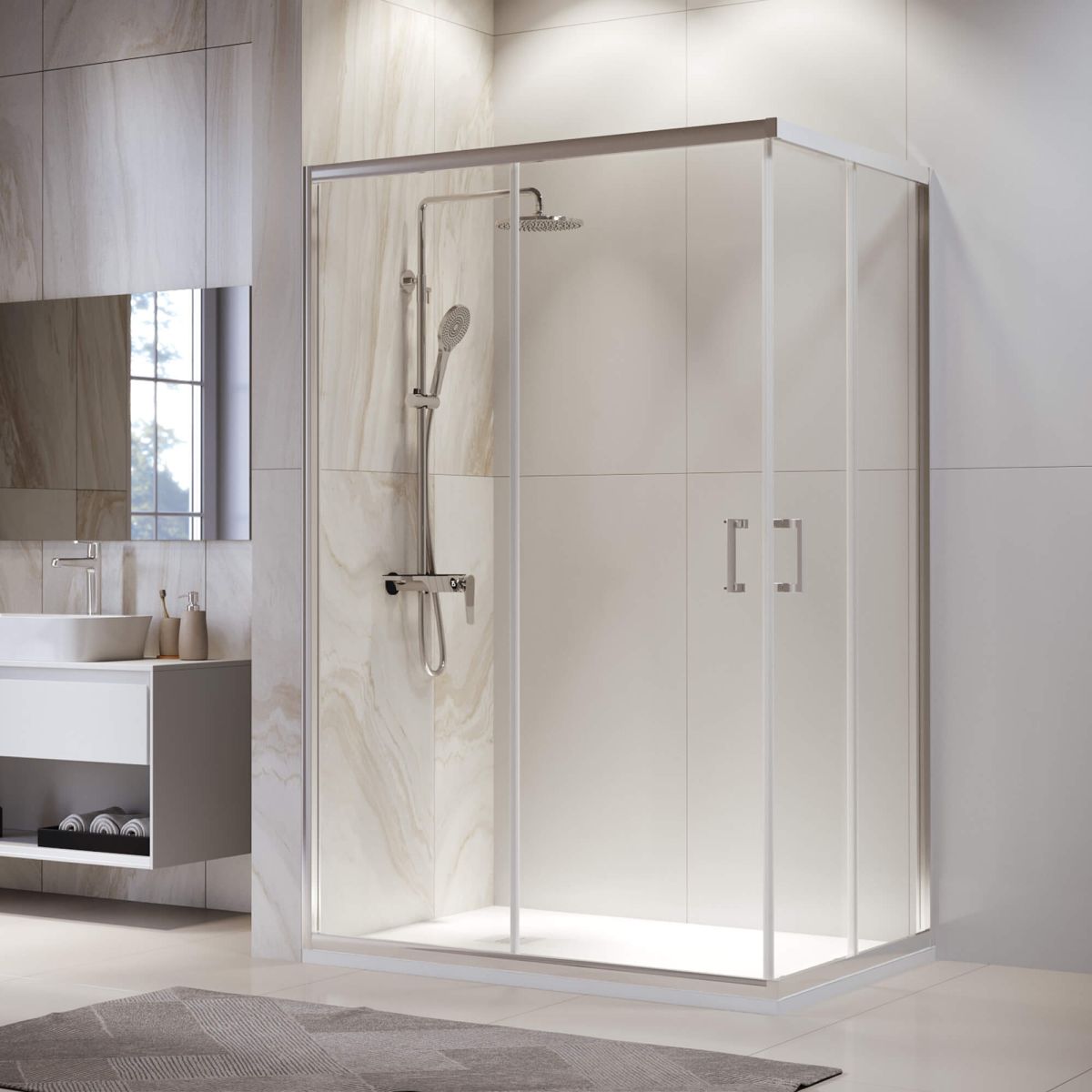 Высота душевого угла составляет 1950 мм, что позволит вам комфортно принимать душ, даже если вы высокого роста. Конструкция дверей раздвижная, что экономит место в ванной комнате. Этот душевой уголок также имеет регулируемый профиль, что позволяет легко настроить его на любые условия установки.