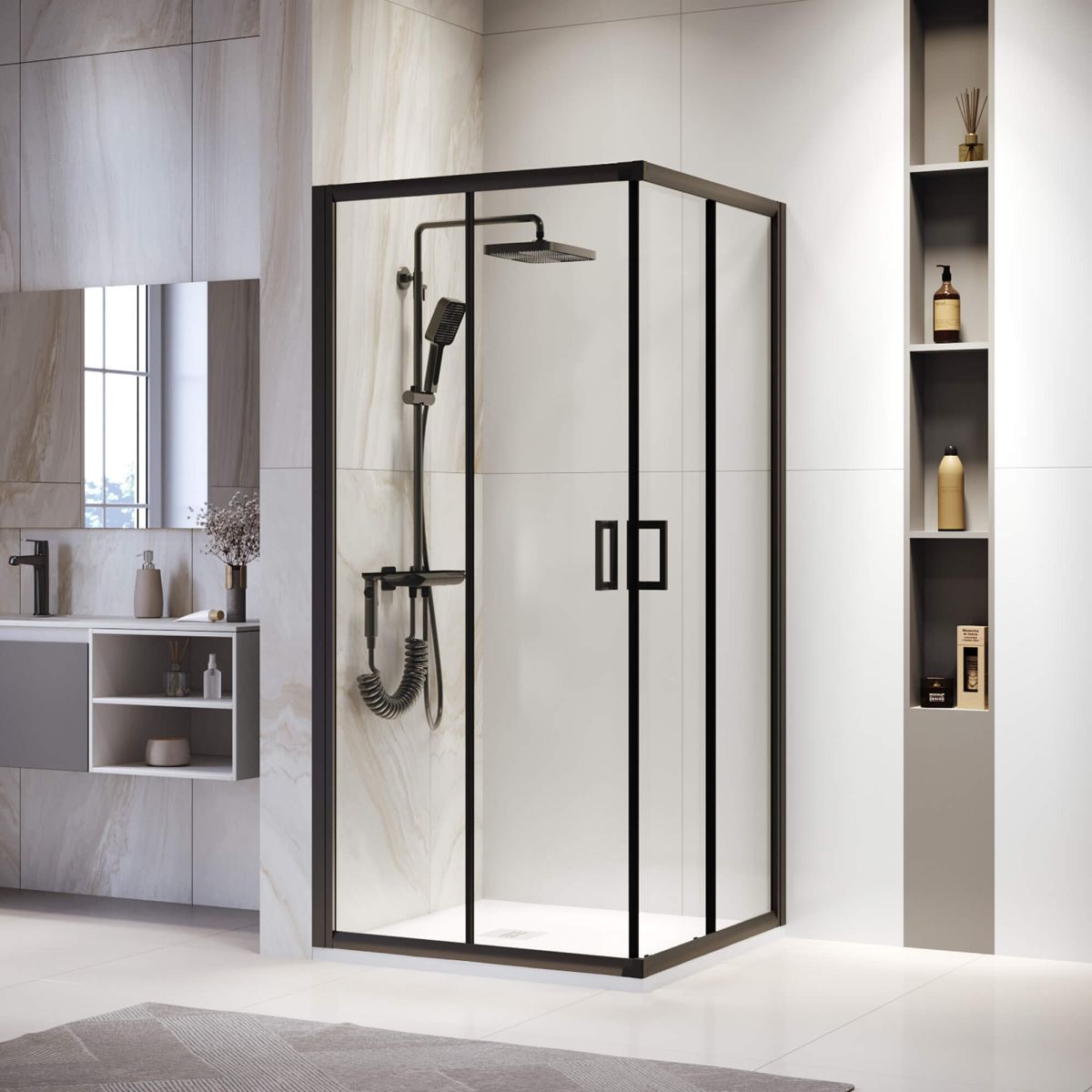 Форма душевого угла квадратная, что делает его идеальным решением для ванной комнаты любого размера. Прозрачное стекло позволяет свету свободно проникать внутрь, создавая яркий и приветливый интерьер. Цвет профиля черный, что придает душевому уголку современный и стильный вид, отлично сочетаясь с другими элементами ванной комнаты.