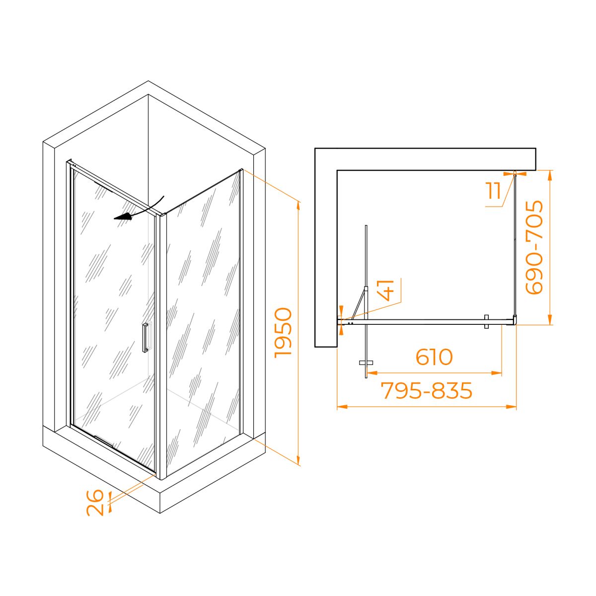 - Высота: 1950 или 2000 мм (в зависимости от модели) — позволяет использовать душевой уголок даже для людей высокого роста.