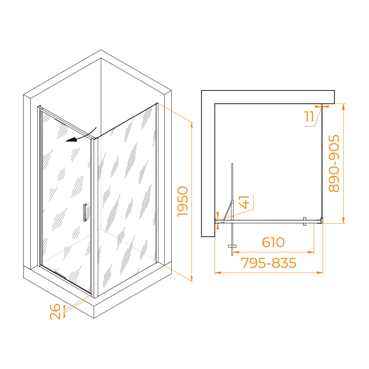 Душевая дверь для ниши роторная при установке образует квадратную либо прямоугольную душевую зону.