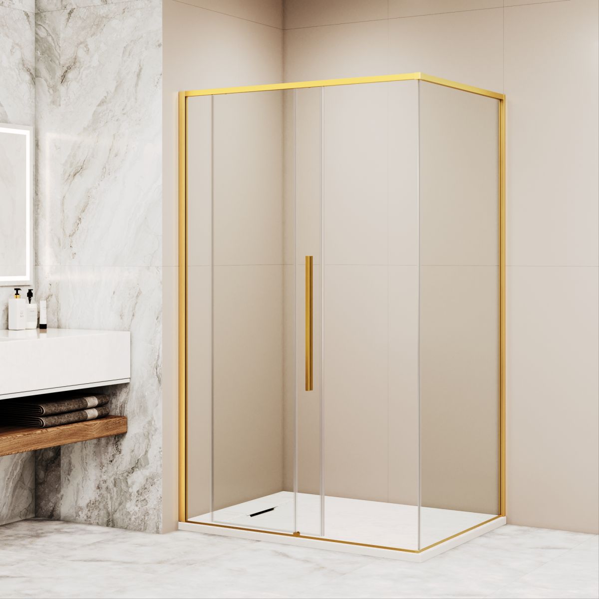 Цвет профиля душевого уголка золото Brush, что придает ему элегантность и подчеркивает стильность дизайна. Высота душевого угла составляет 1950 мм, что позволяет использовать его для людей практически любого роста.