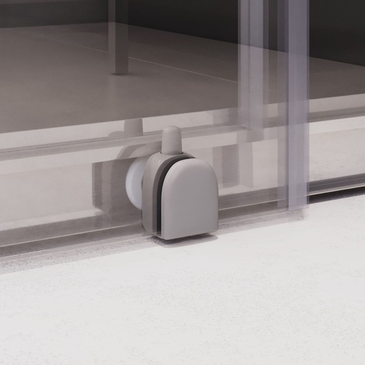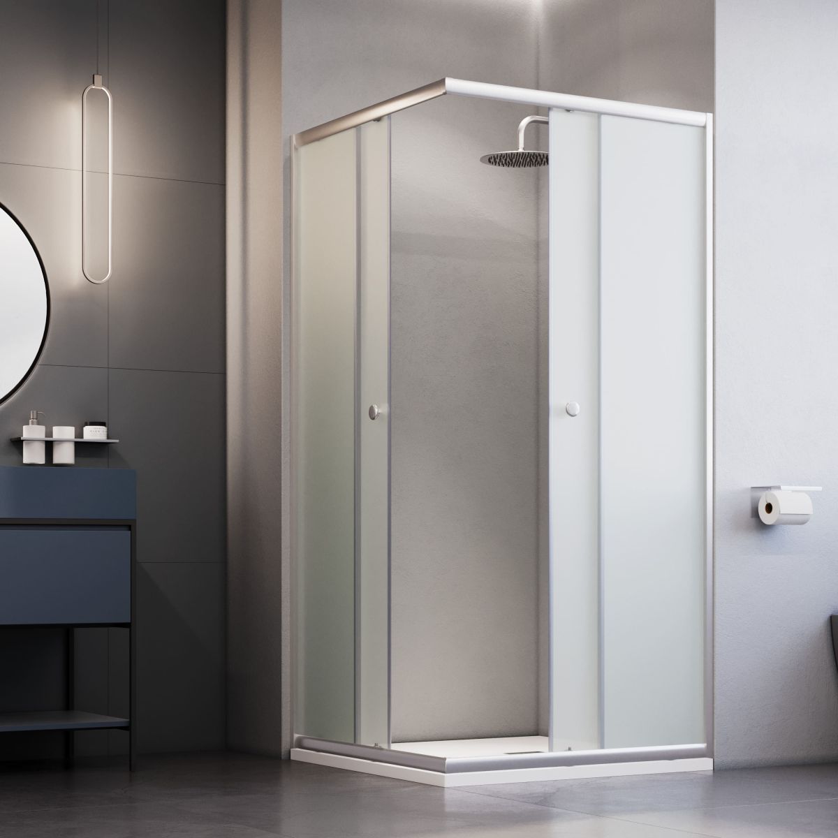 Бюджетный душевой уголок из стекла с раздвижными дверьми в профиле шириной 4 см образует квадратную душевую зону со входом с угла. Стеклянный уголок, ограждающий водяной поток, состоит из двух – стационарных полотен и двух раздвигающихся полотен «Дверь», которые установлены на ролики. При открытии двери плавно сдвигаются, раскрывая широкий вход с угла.