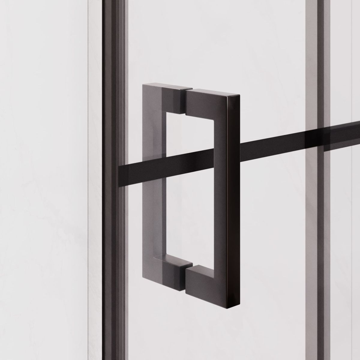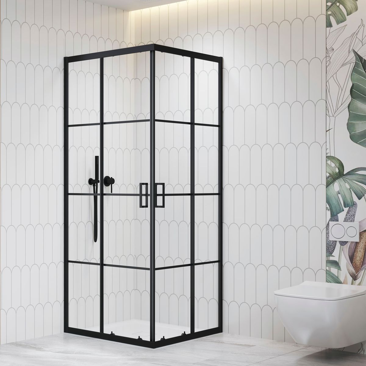 Прозрачное стекло с декоративным рисунком в виде черных линий, образующих квадраты, особенно востребовано в стилях «Loft (лофт)» и «High-tech (хай-тек)». Такой геометрический принт создает эффект графики и чёткости, добавляя индивидуальности и современной элегантности интерьеру ванной комнаты.