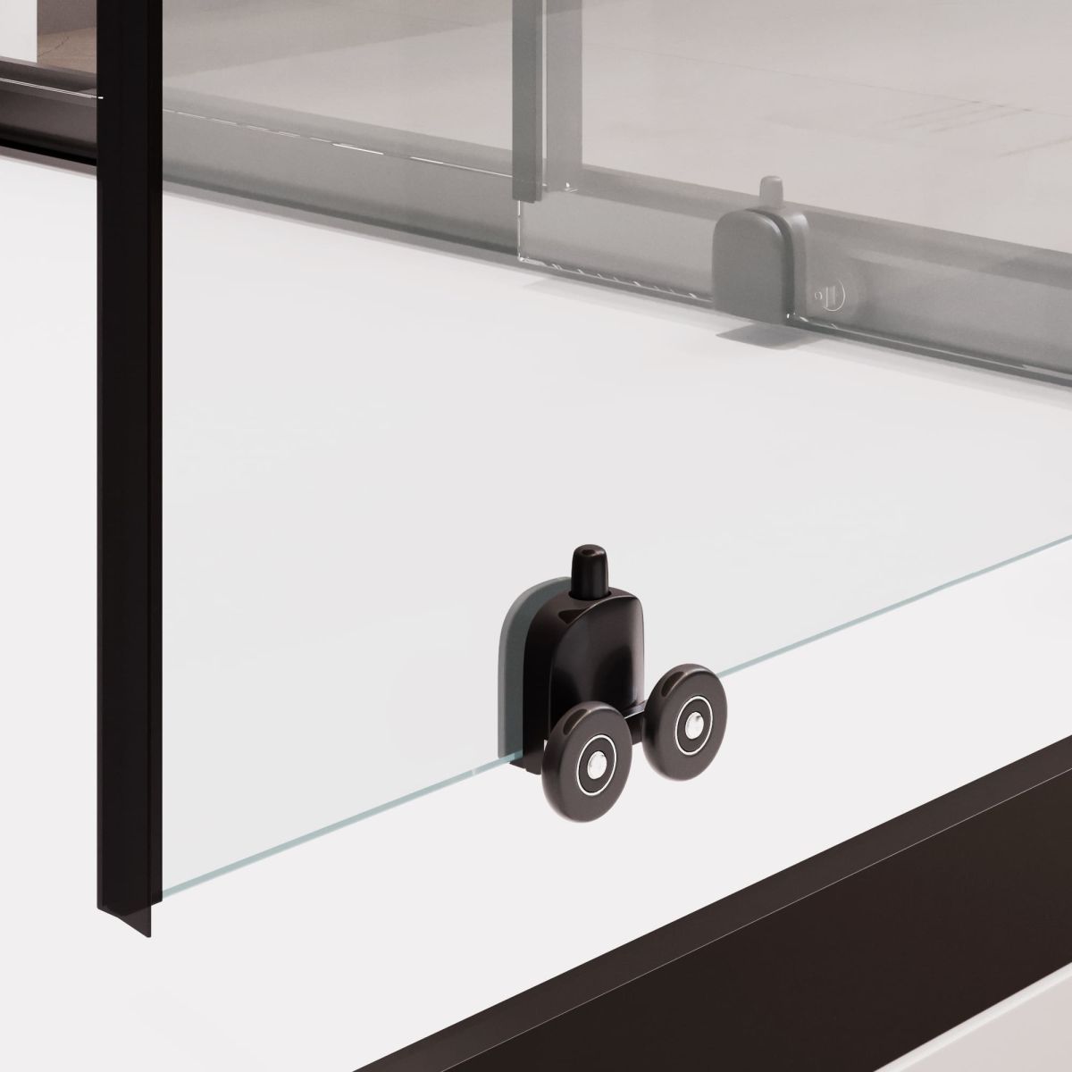 Ручки типа скоба – 160 мм - сплав пластика ABS-tc, черные. Ручки из ABS-tc пластика не поддаются коррозии и всегда теплые при использовании. Ролики – двойные стальные на каретке, пластиковая декоративная крышка роликов в цвет профиля. Угловой коннектор выполнен из ABS-tc (усиленный пластик с добавлением титана)!
