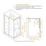 Прямоугольный угол образуют три стекла - два стационарных полотна и одно полотно «Дверь», которое при нажатии на дверную ручку плавно толкает дверное полотно вовнутрь душевой зоны к боковому стационарному стеклу. Магнитный замок, вмонтированный в профиль двери, качественно герметизирует вход.