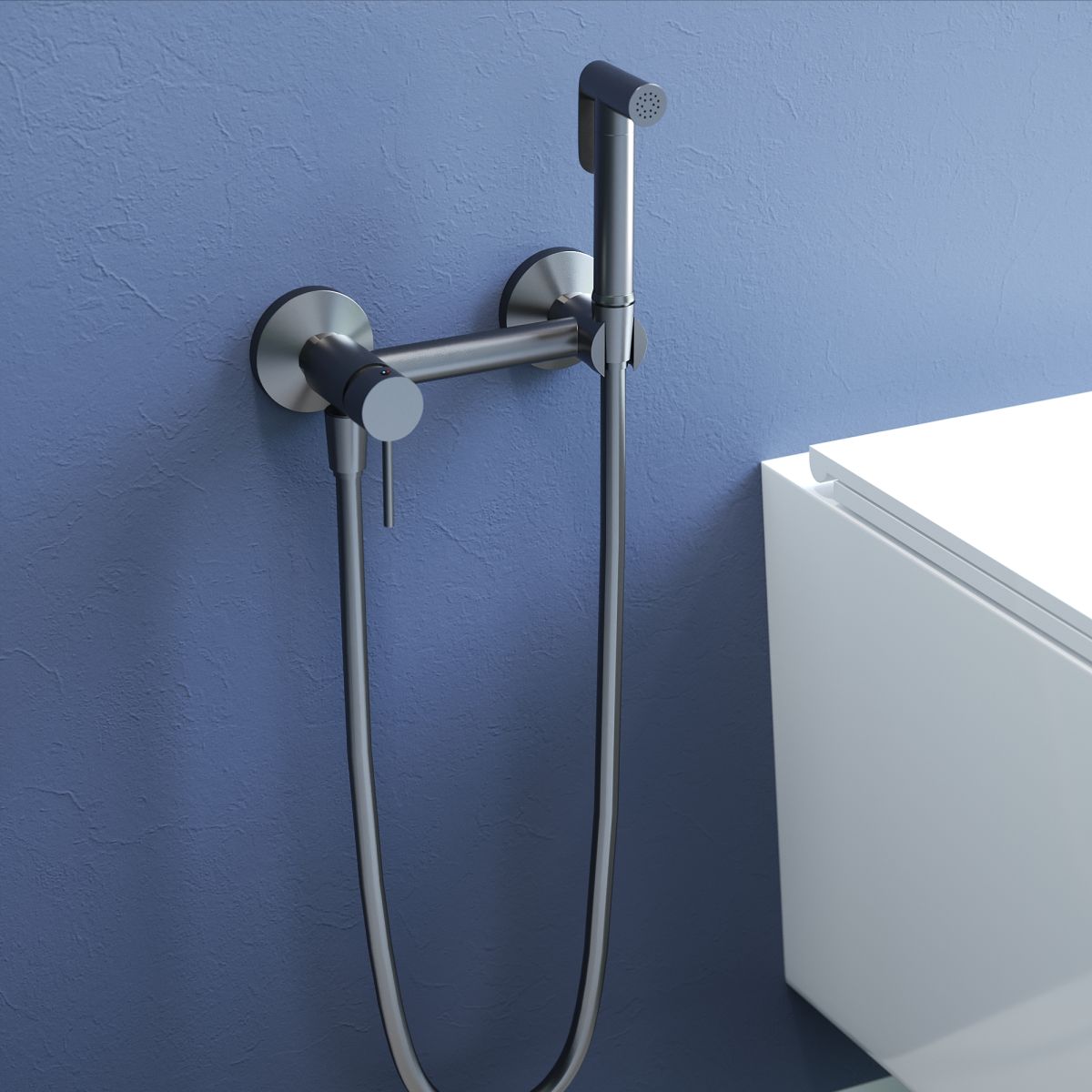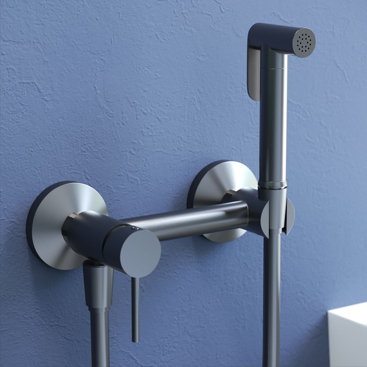 Смеситель круглой формы с рычажным управлением и встроенной опорой для лейки, лейка имеет среднюю струю подачи воды. Струя из гигиенического душа выходит плотная, упругая и направленная. Она может быть как мягкой рассеянной, так и интенсивной, в зависимости от выбранного напора воды. Её температура легко регулируется от прохладной до комфортно-тёплой. Вода подаётся равномерно без пульсаций, обеспечивая точное и аккуратное использование. Форма струи в этой модели узконаправленная, что делает её удобной для гигиенических процедур.