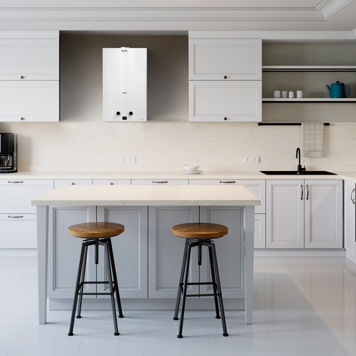 Классический белый глянцевый цвет и современный дизайн позволят прибору органично вписаться в интерьерный стиль любого помещения, делая его естественной частью как кухонного пространства, так и в ванной комнаты.
