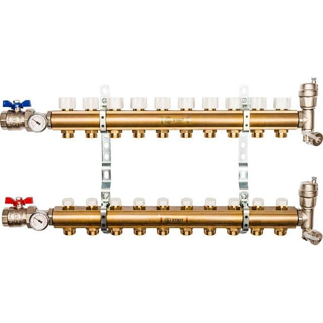 Распределительный коллектор из латуни без расходомеров STOUT 10 выходов