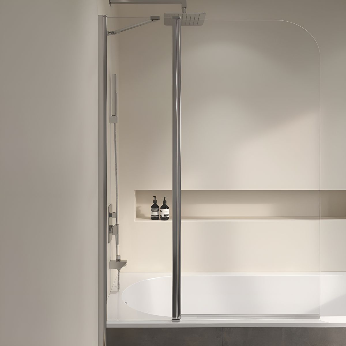 Стекло прозрачное, что придает ванной комнате дополнительный объем и свет. Цвет профиля выполнен в стильном хромированном оттенке, что подчеркивает современный дизайн шторки. Конструкция створки шторки маятниковые, что позволяет ее легко открывать и закрывать.