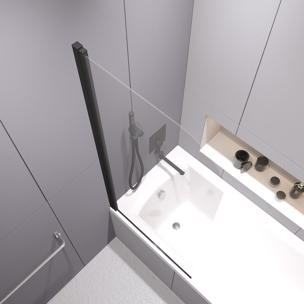 Прозрачное стекло позволяет использовать естественное освещение ванной комнаты, обеспечивая максимальную яркость и прозрачность. Цвет профиля шторки черный, что придает ей элегантный и современный вид. Высота стеклянной шторки составляет 1500 мм, что подходит для большинства стандартных ванн.