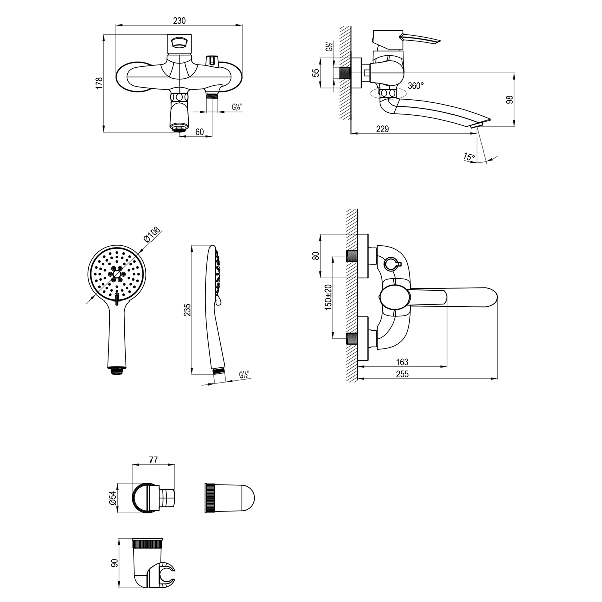 • Аксессуары в комплекте: шланг 1,5 м, 3-функциональная лейка Ø106х235 мм, настенное поворотное крепление