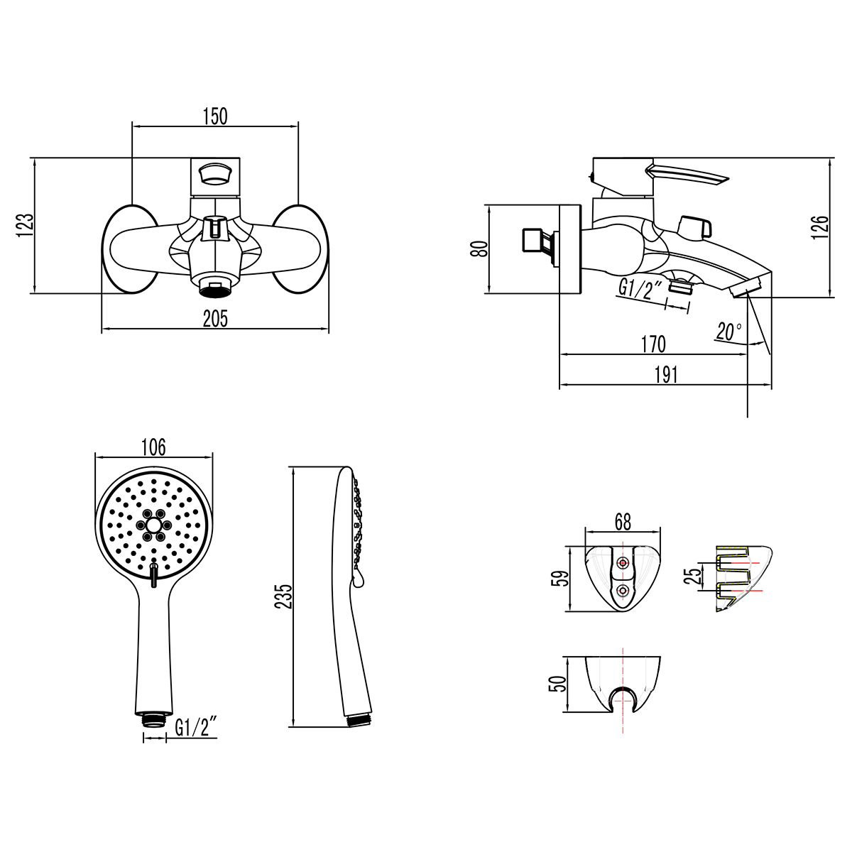 - Аксессуары в комплекте: шланг 1,5 м, настенное фиксированное крепление, 3-функциональная лейка Ø106х235 мм