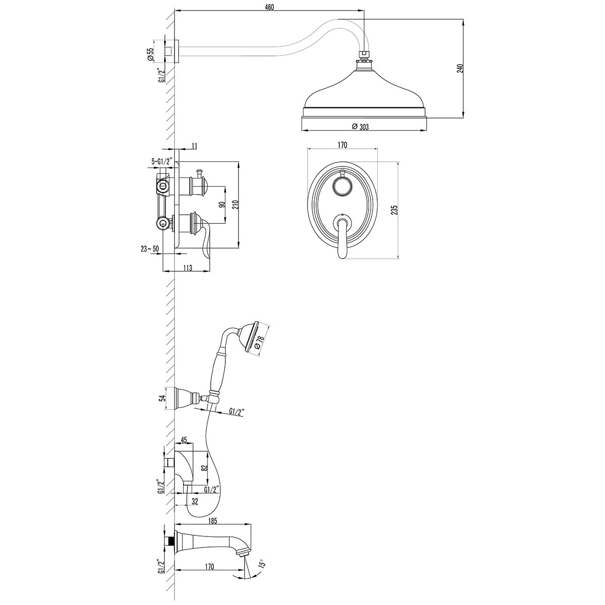 • Держатель верхней душевой лейки 460 мм