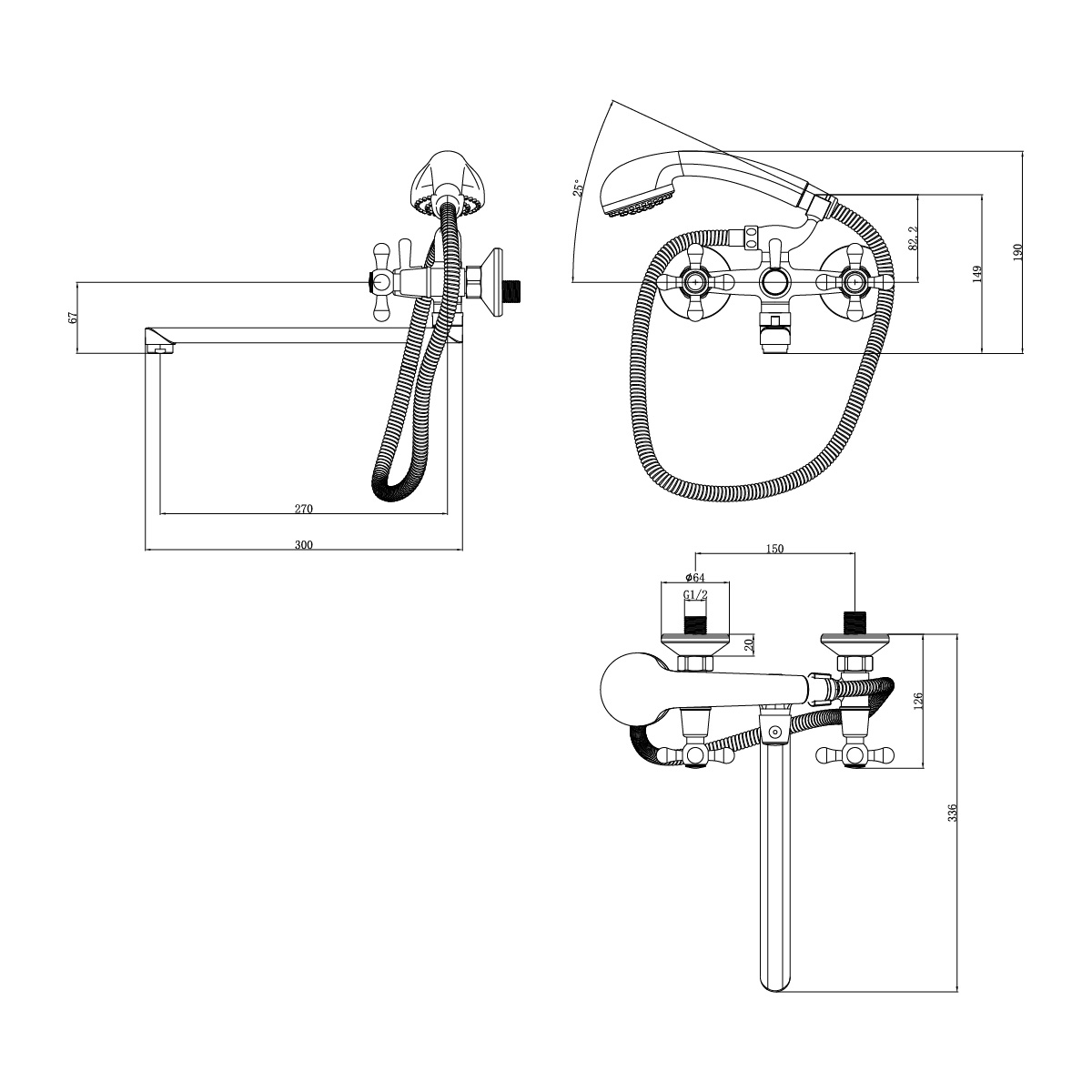 - Аксессуары в комплекте: шланг 1,5 м, настенное поворотное крепление, 5-функциональная лейка Ø83x203 мм