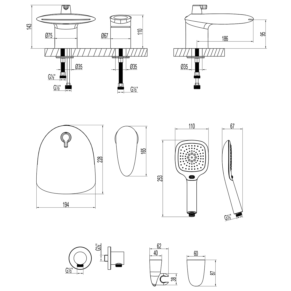 - Аксессуары в комплекте: душевой шланг 2 м, 3-функциональная лейка 111х253 мм