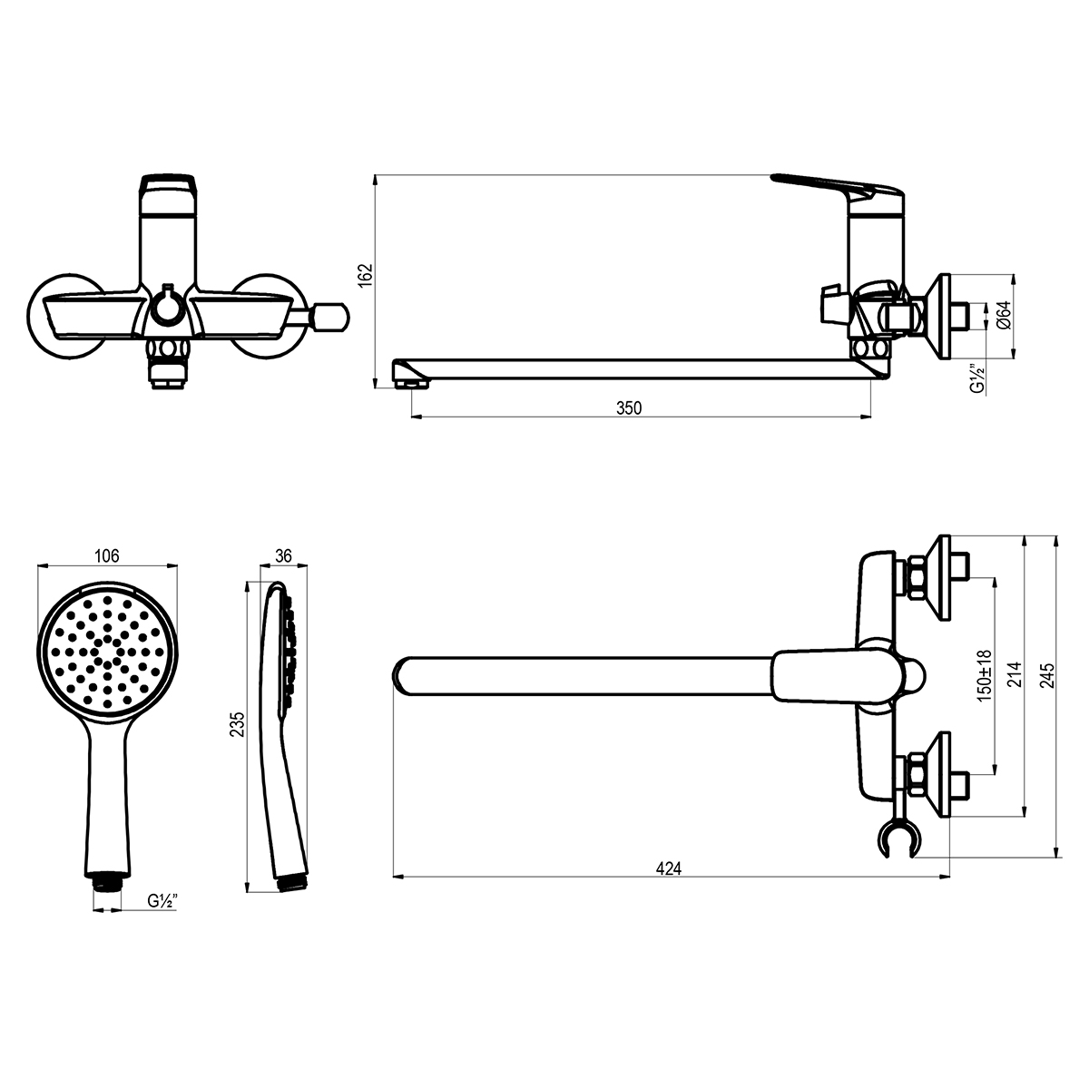 • Аксессуары в комплекте: 1-функциональная лейка Ø106×235 мм, душевой шланг 1,5 м