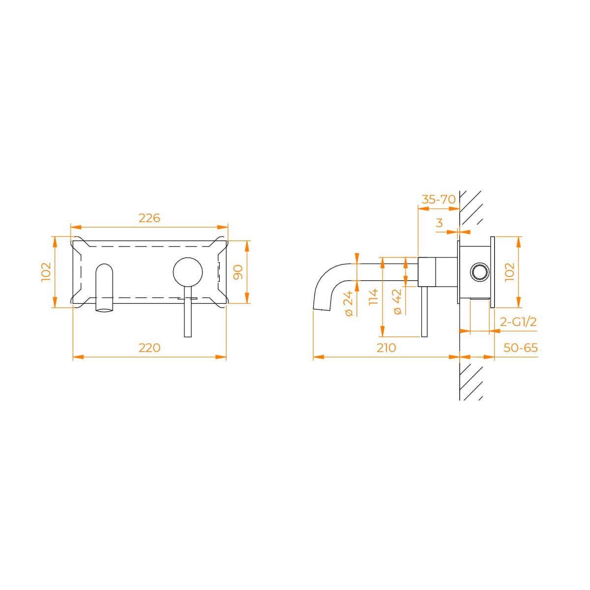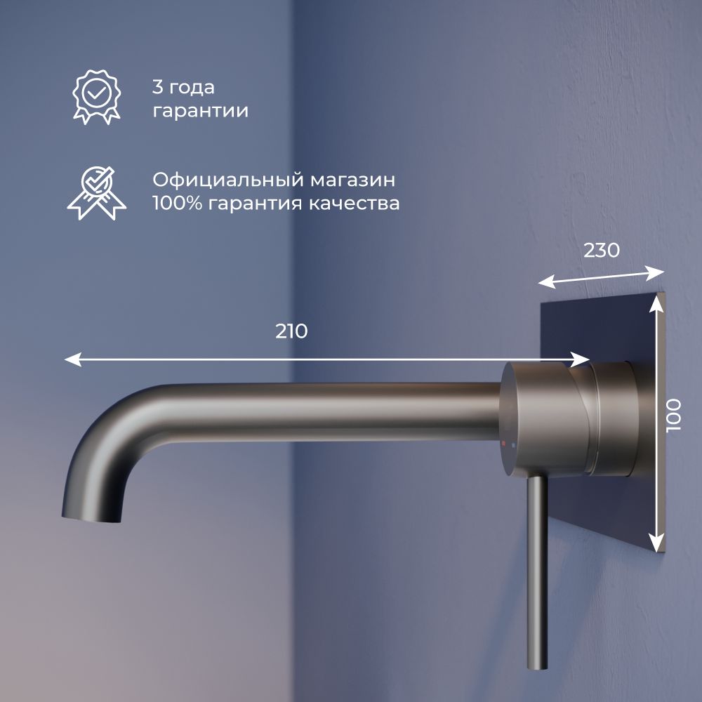 Глубина встраивания смесителя составляет 50-75 мм, а диаметр подключения — 1/2 дюйма, что обеспечивает легкость установки и подключения к системе водоснабжения. Размеры смесителя 230x100x210 мм позволяют ему компактно вписаться в любое пространство, даже в небольшую ванную комнату.