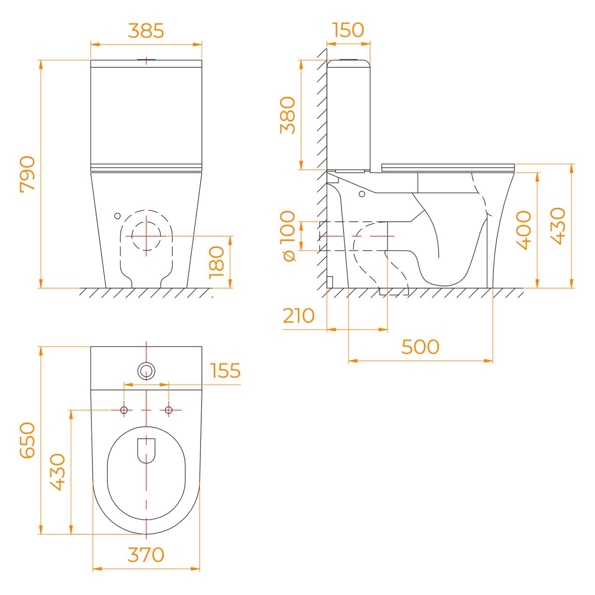 Унитаз имеет короткий выпуск слива и совместим со всеми системами отвода. Используя необходимый тип патрубка (гофры), его можно присоединить к канализации с горизонтальным, косым и вертикальным канализационным стоком.