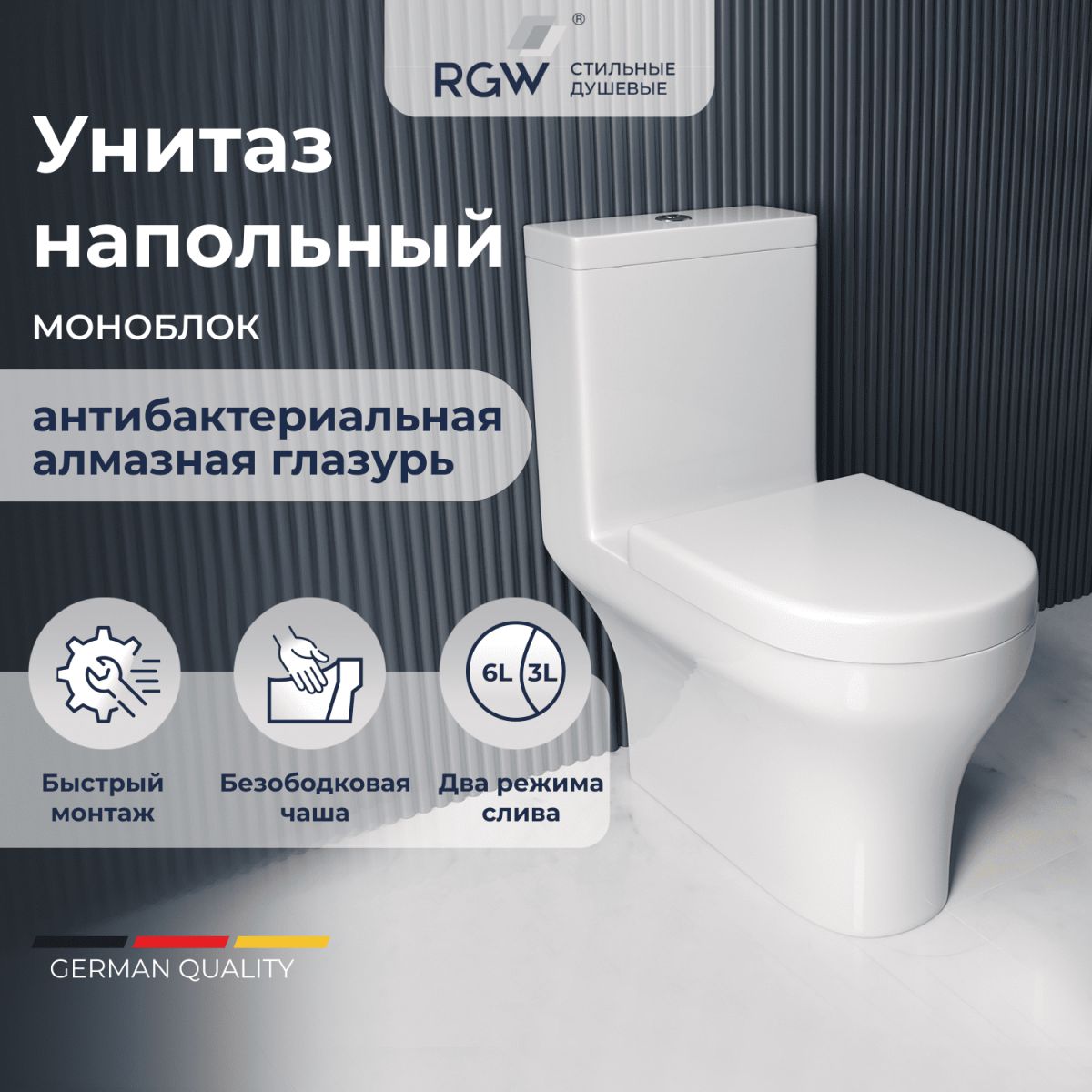 Унитаз RGW SW-05 — напольный унитаз, выполненный по немецкой технологии. Он представляет собой монолитную конструкцию (моноблок), где чаша и бачок являются единым целым. Такое конструкторское решение упрощает установку унитаза и делает его более эстетичным предметом ванной комнаты или туалета.
