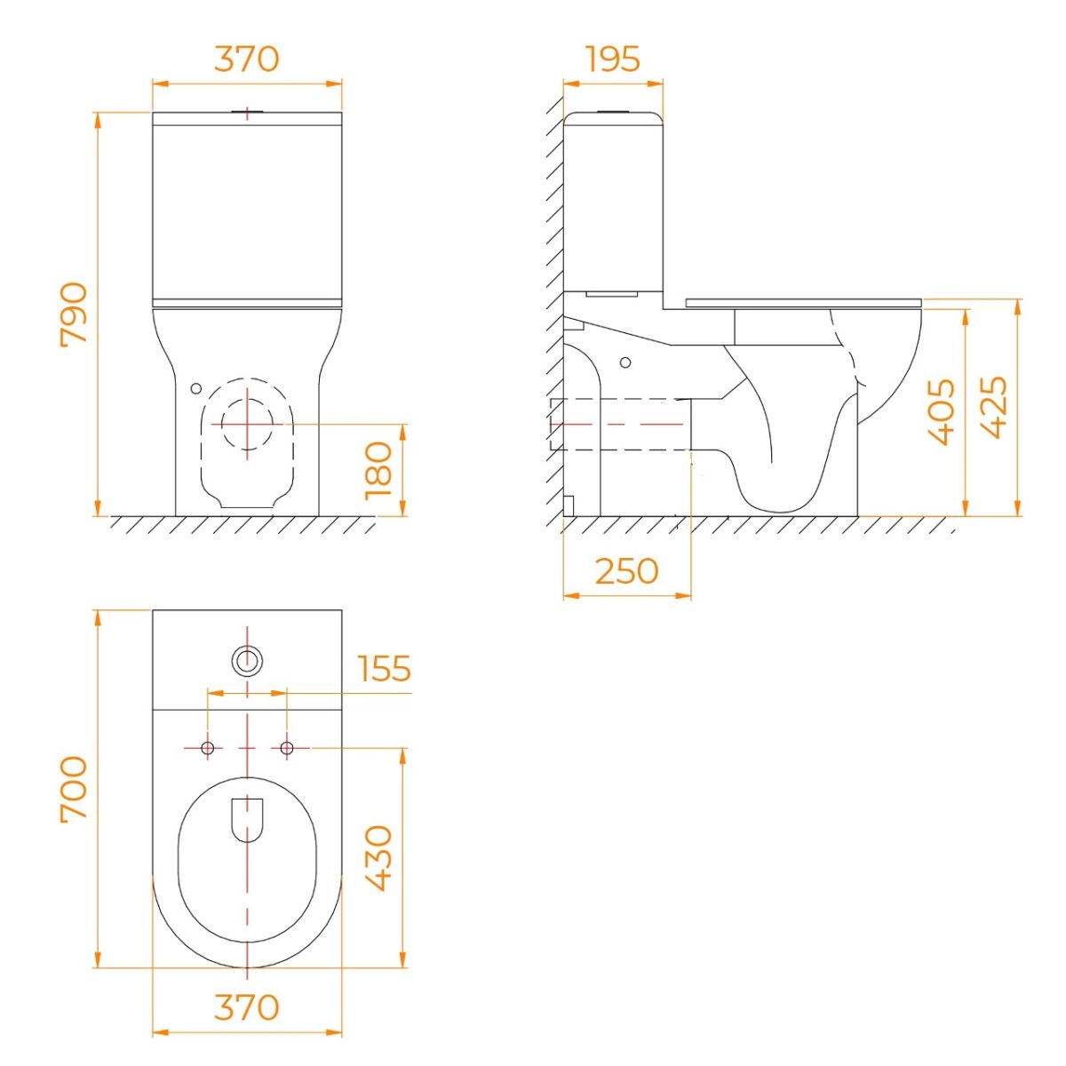 Унитаз имеет короткий выпуск слива и совместим со всеми системами отвода. Используя необходимый тип патрубка (гофры), его можно присоединить к канализации с горизонтальным, косым и вертикальным канализационным стоком.