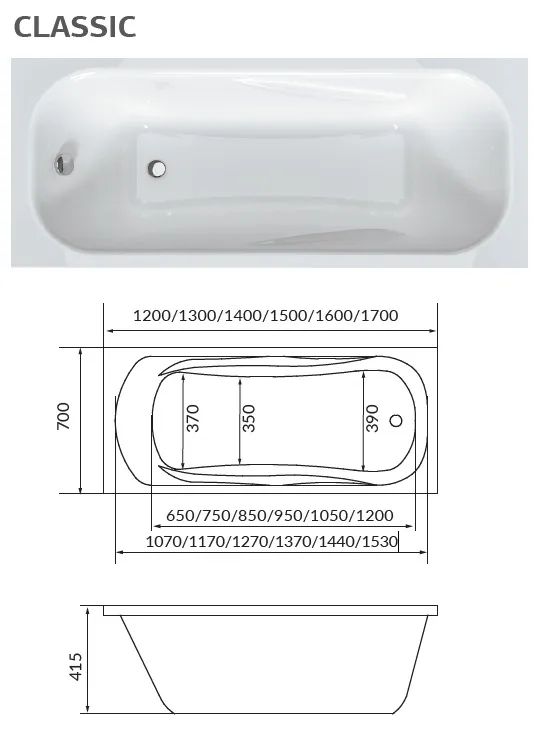 - широкий размерный ряд от 120 до 170 см - возможность подобрать понравившуюся модель под любой размер ванной комнаты;