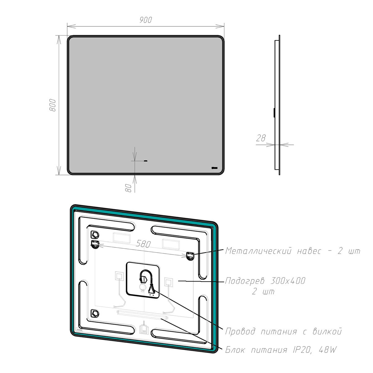 Зеркало Lemark MIOBLACK 90х80 см с интерьерной подсветкой, с подогревом